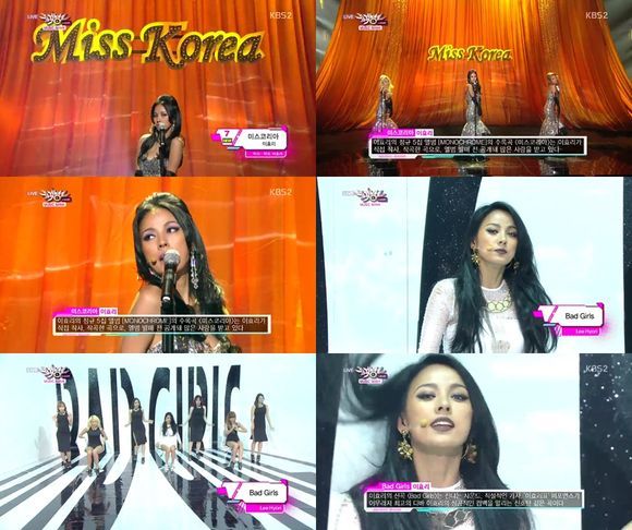 가수 이효리는 24일 오후 방송된 KBS 2TV ‘뮤직뱅크’에서 ‘미스코리아’와 타이틀곡 ‘배드 걸스(Bad Girls)'로 화려한 컴백을 알렸다.