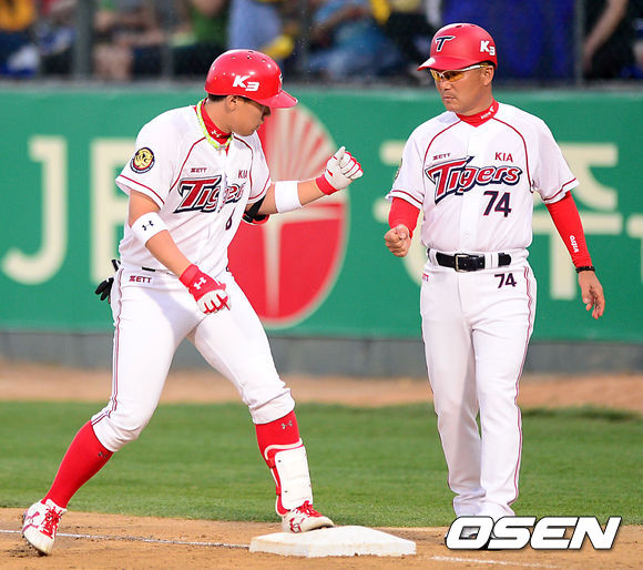 24일 오후 광주 무등야구장에서 열린 '2013 한국야쿠르트 세븐 프로야구' KIA 타이거즈와 NC 다이노스의 경기, 3회말 무사에서 KIA 안치홍이 우전 안타를 치고 김평호 코치와 하이파이브를 하고 있다.