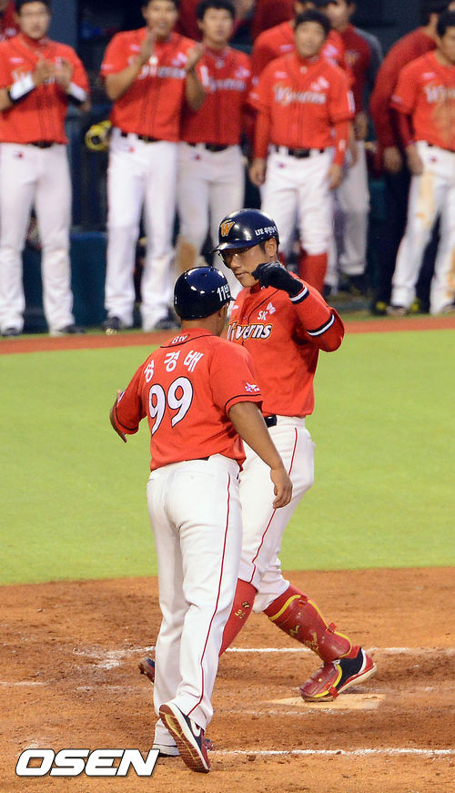 24일 오후 서울 잠실구장에서 열린 '2013 한국야쿠르트 세븐 프로야구' LG 트윈스와 SK 와이번스의 경기, 4회초 1사 SK 박정권이 동점 홈런을 날린 후 홈을 밟고 있다.
