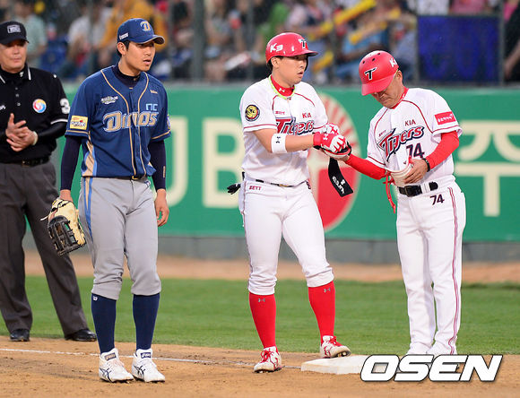 24일 오후 광주 무등야구장에서 열린 '2013 한국야쿠르트 세븐 프로야구' KIA 타이거즈와 NC 다이노스의 경기, 3회말 무사에서 KIA 안치홍이 우전 안타를 치고 김평호 코치에게 보호대를 건네고 있다.