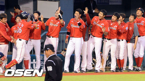 24일 오후 서울 잠실구장에서 열린 '2013 한국야쿠르트 세븐 프로야구' LG 트윈스와 SK 와이번스의 경기, 4회초 1사 SK 박정권이 동점 홈런을 날린 후 동료들의 축하를 받고 있다