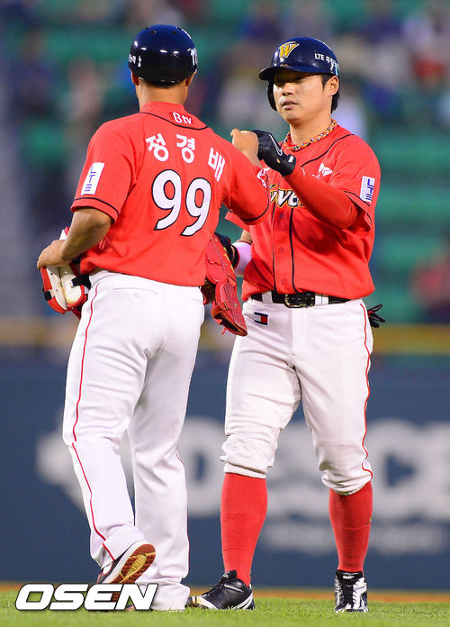 24일 오후 서울 잠실구장에서 열린 '2013 한국야쿠르트 세븐 프로야구' LG 트윈스와 SK 와이번스의 경기, 4회말 2사 만루 SK 박재상이 역전 2타점 적시타를 날리고 정경배 코치와 하이파이브를 하고 있다.