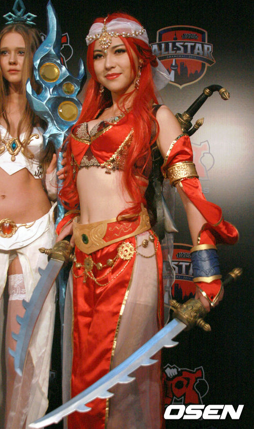 '웨이샤오' 가오 쉐청이 속한 중국과 '더블리프트' 피터 펭이 속한 미국 팀의 경기가 열리기전 포토월에서 모델이 인기 캐릭터 카탈리나를 코스튬플레이 하고 있다.