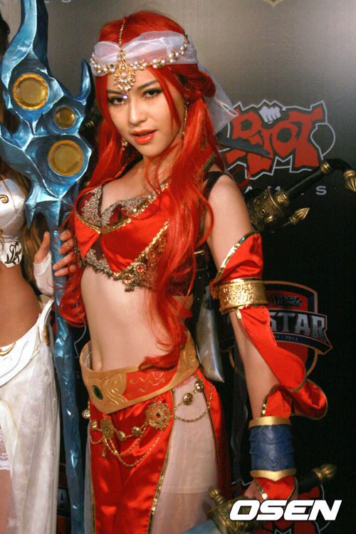 '웨이샤오' 가오 쉐청이 속한 중국과 '더블리프트' 피터 펭이 속한 미국 팀의 경기가 열리기전 포토월에서 모델이 인기 캐릭터 카탈리나를 코스튬플레이 하고 있다.