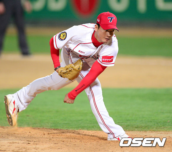 24일 오후 광주 무등야구장에서 열린 '2013 한국야쿠르트 세븐 프로야구' KIA 타이거즈와 NC 다이노스의 경기, 5회말 무사에서 KIA 선발 투수 서재응과 교체된 임준섭이 힘차게 공을 던지고 있다.