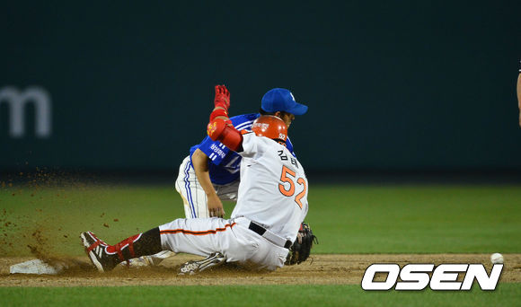 24일 오후 대전구장에서 '2013 한국야쿠르트 세븐 프로야구' 한화 이글스 대 삼성 라이온즈의 경기가 열렸다. 5회말 한화 공격 선두타자로 나선 4번 김태균이 우익선상 2루타를 날리고 슬라이딩해 세이프 되고 있다.