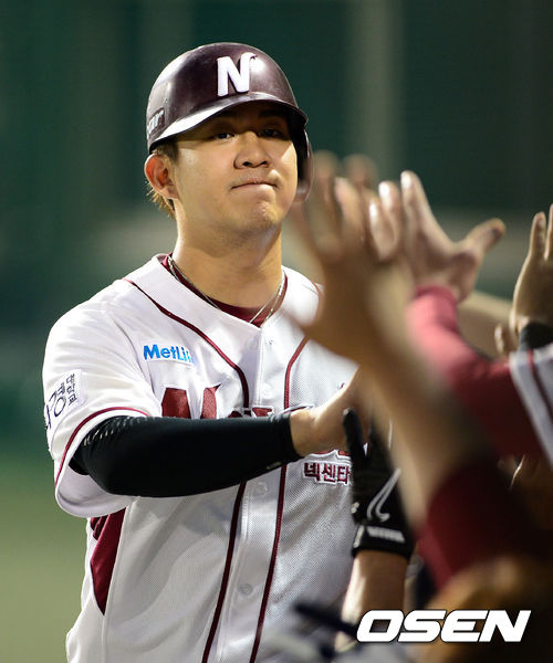 24일 오후 서울 목동야구장에서 열린 '2013 한국야쿠르트 세븐 프로야구' 넥센 히어로즈와 롯데 자이언츠의 경기, 5회말 1사 3루에서 넥센 김민성이 유한준의 내야땅볼에 홈을 밟고 더그아웃에서 동료선수들과 하이파이브를 하고 있다.