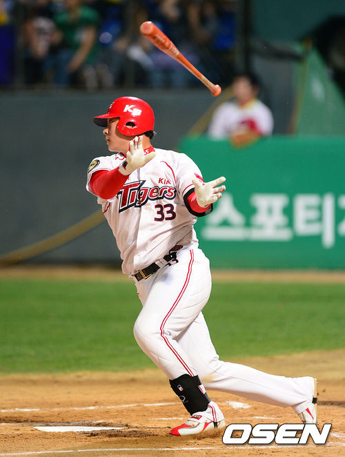 24일 오후 광주 무등야구장에서 열린 '2013 한국야쿠르트 세븐 프로야구' KIA 타이거즈와 NC 다이노스의 경기, 6회말 2사에서 KIA 김주형이 우전 안타를 치고 있다.