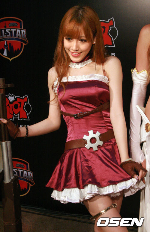 '웨이샤오' 가오 쉐청이 속한 중국과 '더블리프트' 피터 펭이 속한 미국 팀의 경기가 열리기전 포토월에서 모델이 인기 캐릭터 케이틀린을 코스튬플레이 하고 있다.