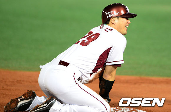 24일 오후 서울 목동야구장에서 열린 '2013 한국야쿠르트 세븐 프로야구' 넥센 히어로즈와 롯데 자이언츠의 경기, 6회말 1사 1,2루 넥센 강정호 타석에 이택근이 3루 도루를 시도하다 롯데 황재균에 태그아웃당하고 아쉬워하고 있다.