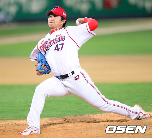 24일 오후 광주 무등야구장에서 열린 '2013 한국야쿠르트 세븐 프로야구' KIA 타이거즈와 NC 다이노스의 경기, 8회초 무사에서 KIA 박경태가 힘차게 공을 던지고 있다.