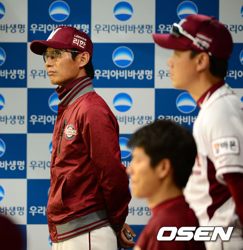 24일 오후 서울 목동야구장에서 열린 '2013 한국야쿠르트 세븐 프로야구' 넥센 히어로즈와 롯데 자이언츠의 경기, 2대1로 뒤진 9회초 염경엽 감독이 더그아웃에서 경기를 지켜보고 있다.