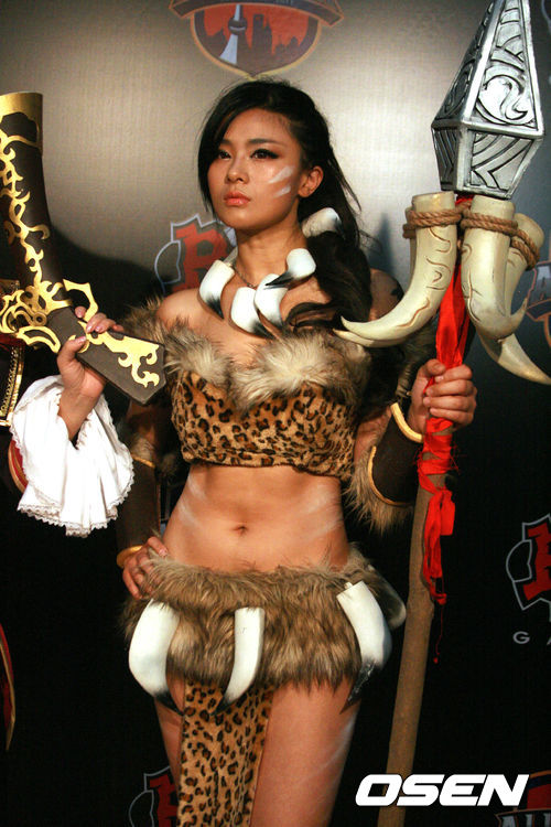 '웨이샤오' 가오 쉐청이 속한 중국과 '더블리프트' 피터 펭이 속한 미국 팀의 경기가 열리기전 포토월에서 모델이 인기 캐릭터 니달리가 코스튬플레이 하고 있다.