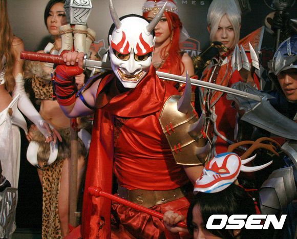 '웨이샤오' 가오 쉐청이 속한 중국과 '더블리프트' 피터 펭이 속한 미국 팀의 경기가 열리기전 포토월에서 모델이 인기 캐릭터 쉔을 코스튬플레이 하고 있다.