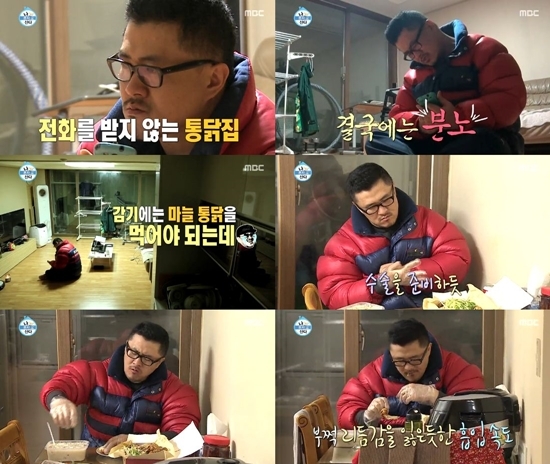 가수 데프콘이 감기 기운에 시달리며 슬픈 마늘통닭 '먹방'을 선보였다.