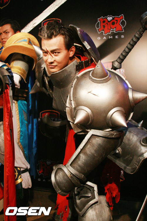 '웨이샤오' 가오 쉐청이 속한 중국과 '더블리프트' 피터 펭이 속한 미국 팀의 경기가 열리기전 포토월에서 모델이 인기 캐릭터 다리우스를 코스튬플레이 하고 있다.