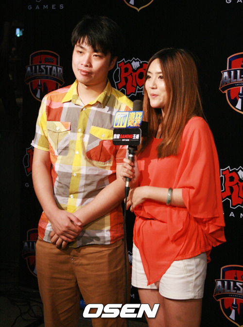 중국을 대표하는 워크래프트3 프로게이머 '스카이' 리사오펑이 '롤 올스타전 2013' 현장을 방문해 미녀 리포터와 인터뷰 중이다.
