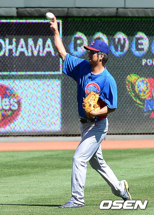 25일 오전(이하 한국시간) 미국 오하이오주 신시내티 그레이트 아메리칸 볼파크에서 열리는 신시내티 레즈와 시카고 컵스의 경기 시작 전 시카고 컵스 후지카와가 훈련을 하고 있다.