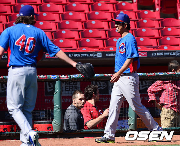 25일 오전(이하 한국시간) 미국 오하이오주 신시내티 그레이트 아메리칸 볼파크에서 열리는 신시내티 레즈와 시카고 컵스의 경기 시작 전 후지카와가 훈련을 마치고 덕아웃으로 향하고 있다.