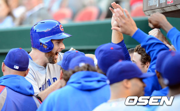 25일 오전(이하 한국시간) 미국 오하이오주 신시내티 그레이트 아메리칸 볼파크에서 열린 신시내티 레즈와 시카고 컵스의 경기 2회초 2사 1루 펠드만이 투런포를 친 후 동료들과 하이파이브를 하고 있다.
