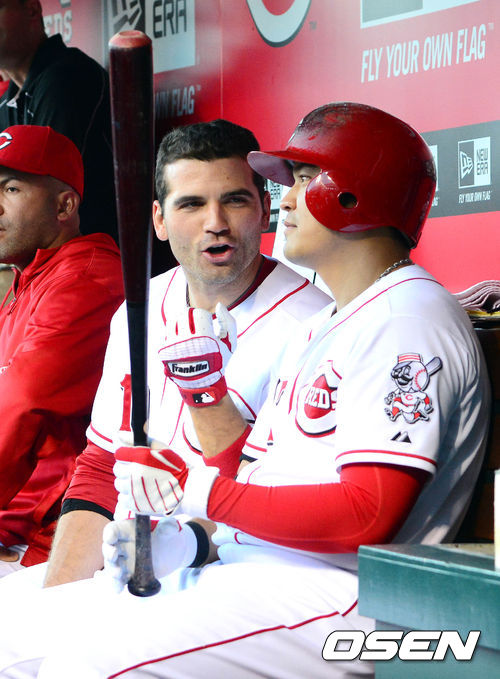 25일 오전(이하 한국시간) 미국 오하이오주 신시내티 그레이트 아메리칸 볼파크에서 열린 신시내티 레즈와 시카고 컵스의 경기 3회말 추신수가 조이 보토와 덕아웃에서 이야기를 나누고 있다.