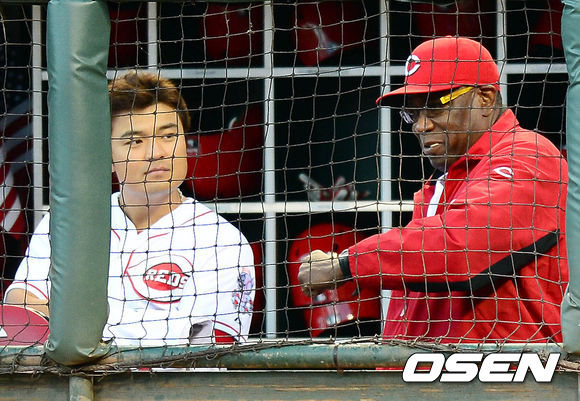 25일 오전(이하 한국시간) 미국 오하이오주 신시내티 그레이트 아메리칸 볼파크에서 열린 신시내티 레즈와 시카고 컵스의 경기 4회말 추신수가 덕아웃에서 더스티 베이커 감독과 이야기를 나누고 있다.