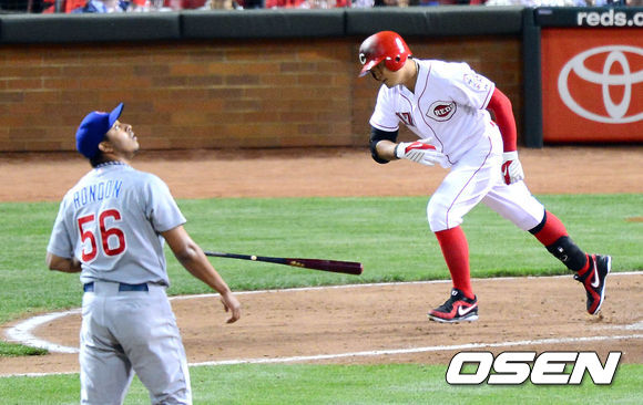 25일 오전(이하 한국시간) 미국 오하이오주 신시내티 그레이트 아메리칸 볼파크에서 열린 신시내티 레즈와 시카고 컵스의 경기 7회말 1사 추신수가 좌익수 플라이를 치고 달리고 있다.