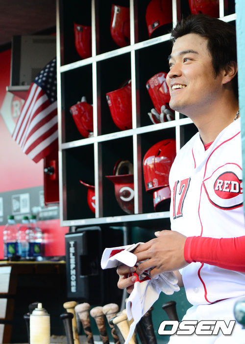 25일 오전(이하 한국시간) 미국 오하이오주 신시내티 그레이트 아메리칸 볼파크에서 열린 신시내티 레즈와 시카고 컵스의 경기, 추신수가 덕아웃에서 미소를 짓고 있다.