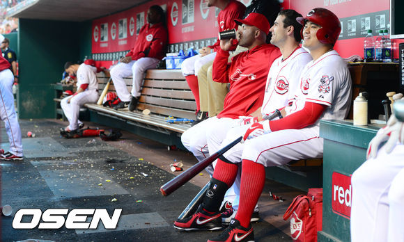 25일 오전(이하 한국시간) 미국 오하이오주 신시내티 그레이트 아메리칸 볼파크에서 열린 신시내티 레즈와 시카고 컵스의 경기 3회말 추신수가 덕아웃에서 경기를 지켜보고 있다.