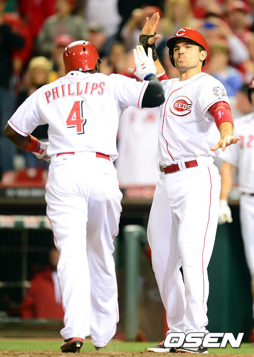 25일 오전(이하 한국시간) 미국 오하이오주 신시내티 그레이트 아메리칸 볼파크에서 열린 신시내티 레즈와 시카고 컵스의 경기 8회말 무사 1루 투런포를 친 필립스와 조이 보토가 하이파이브를 하고 있다.
