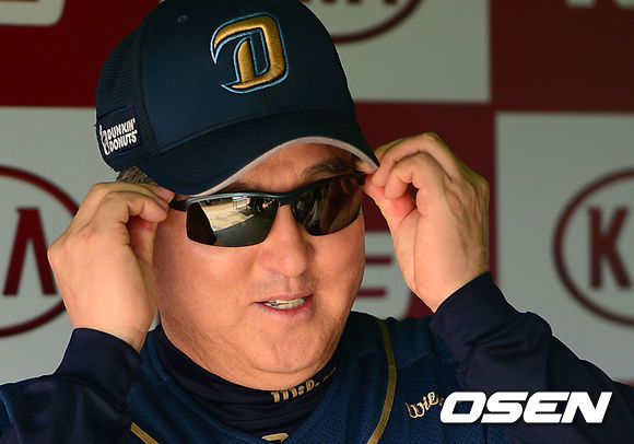 25일 오후 광주 무등야구장에서 열린 '2013 한국야쿠르트 세븐 프로야구' KIA 타이거즈와 NC 다이노스의 경기, 경기에 앞서 NC 김경문 감독이 덕아웃에서 취재진과 이야기를 나누고 있다.