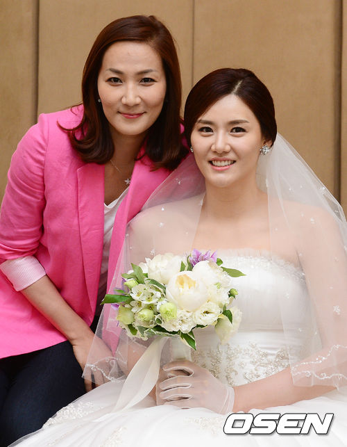강영숙이 신부 대기실에서 부케를 받는 팀 동료 신정자와 포즈를 취하고 있다.