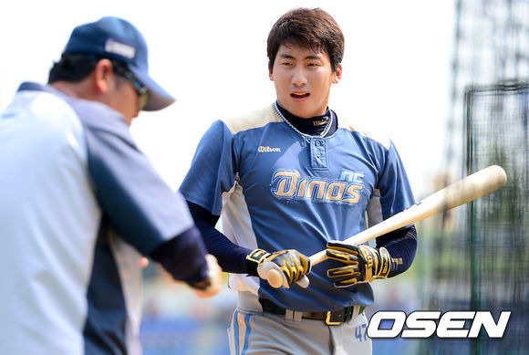 25일 오후 광주 무등야구장에서 열린 '2013 한국야쿠르트 세븐 프로야구' KIA 타이거즈와 NC 다이노스의 경기, 경기에 앞서 NC 나성범이 타격 훈련 중 김광림 코치의 조언에 귀기울이고 있다.