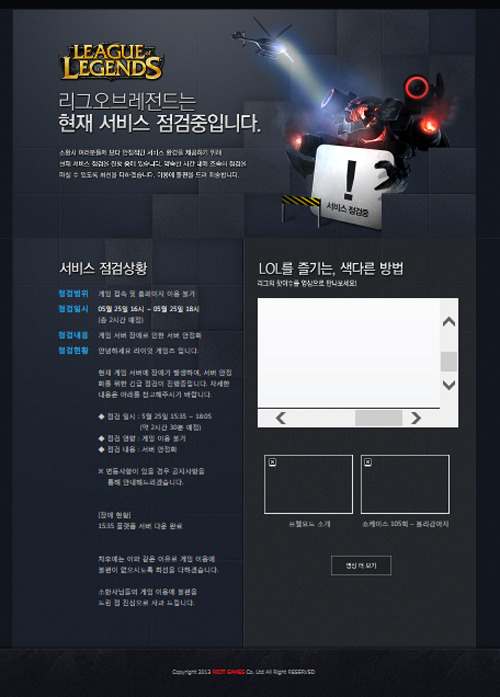 라이엇게임즈 코리아는 25일 오후 4시 긴급 공지를 통해 LOL이 25일 오후 3시 35분 부터 오후 6시 5분까지 약 2시간 30분간 서비스 점검을 실시한다고 밝혔다.