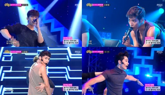 2PM은 25일 오후 방송된 MBC 가요프로그램 '음악중심'에서 의자를 이용한 퍼포먼스, 셀프스킨십 댄스로 남성미를 뽐냈다.