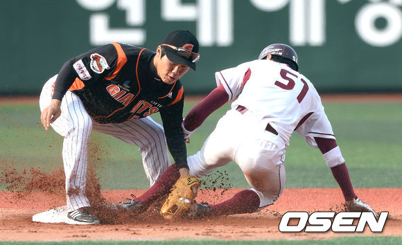 25일 오후 서울 목동구장에서 열린 '2013 한국야쿠르트 세븐 프로야구' 넥센 히어로즈와 롯데 자이언츠의 경기, 1회말 무사 1루 넥센 장기영이 2루 도루를 성공하고 있다.