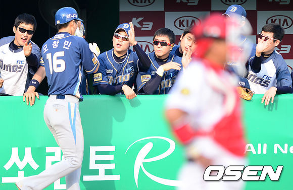 25일 오후 광주 무등야구장에서 열린 '2013 한국야쿠르트 세븐 프로야구' KIA 타이거즈와 NC 다이노스의 경기, 2회초 2사 1,3루에서 NC 노진혁의 중전 적시타 때 홈을 밟은 3루주자 모창민이 덕아웃에서 동료들과 하이파이브를 하고 있다.