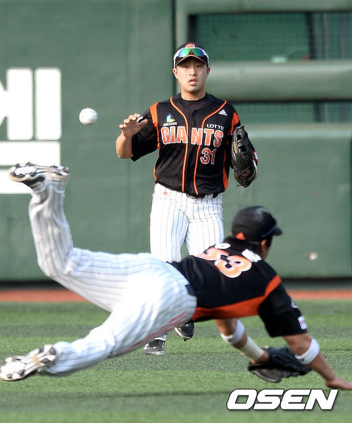 25일 오후 서울 목동구장에서 열린 '2013 한국야쿠르트 세븐 프로야구' 넥센 히어로즈와 롯데 자이언츠의 경기, 1회말 1사 3루 넥센 이택근의 타구가 롯데 손아섭과 정훈의 사이에 떨어지고 있다.
