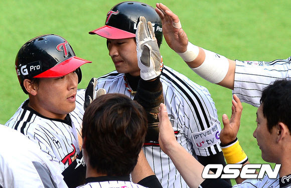 25일 오후 서울 잠실야구장에서 열린 '2013 한국야쿠르트 세븐 프로야구' LG 트윈스와 SK 와이번스의 경기, 3회말 1사 3루에서 LG 오지환의 희생플라이에 윤요섭이 홈을 밟으며 선제 득점에 성공하고 더그아웃에서 동료선수들과 하이파이브를 하고 있다.