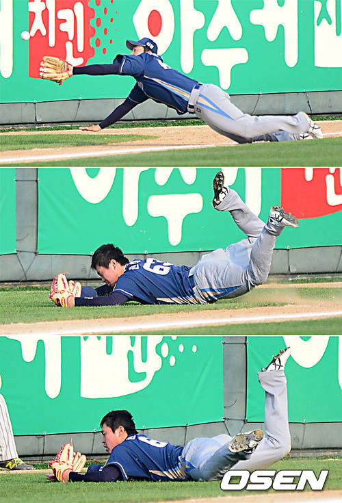 25일 오후 광주 무등야구장에서 열린 '2013 한국야쿠르트 세븐 프로야구' KIA 타이거즈와 NC 다이노스의 경기, 2회말 무사 1루에서 NC 권희동이 KIA 차일목의 타구를 잡아내고 있다.