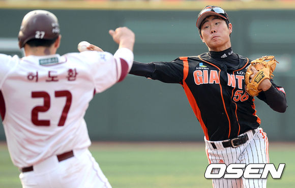 25일 오후 서울 목동구장에서 열린 '2013 한국야쿠르트 세븐 프로야구' 넥센 히어로즈와 롯데 자이언츠의 경기, 2회말 1사 1,2루 롯데 신본기가 장기영의 타구를 잡아 병살처리하고 있다.