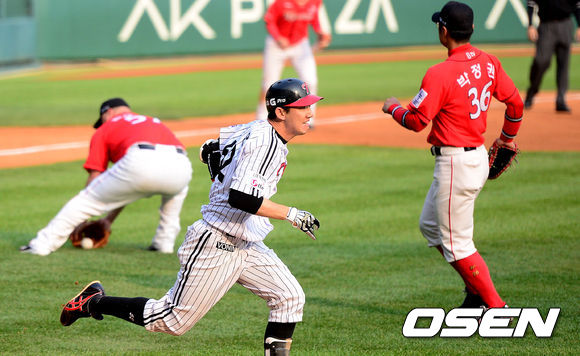 25일 오후 서울 잠실야구장에서 열린 '2013 한국야쿠르트 세븐 프로야구' LG 트윈스와 SK 와이번스의 경기, 3회말 무사 2루에서 LG 손주인이 희생번트를 하며 1루로 전력질주하고 있다.