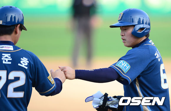 25일 오후 광주 무등야구장에서 열린 '2013 한국야쿠르트 세븐 프로야구' KIA 타이거즈와 NC 다이노스의 경기, 4회초 무사에서 NC 권희동이 번트 안타를 전준호 코치와 하이파이브를 하고 있다.