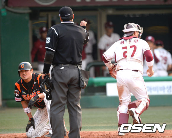 25일 오후 서울 목동야구장에서 열린 '2013 한국야쿠르트 세븐 프로야구' 넥센 히어로즈와 롯데 자이언츠의 경기, 4회초 2사 1,3루 롯데 신본기 타석때 3루 주자 박종윤이 1루주자 김대우의 2루 도루를 틈타 홈으로 쇄도하였지만 넥센 허도환에게 아웃당하고 있다.