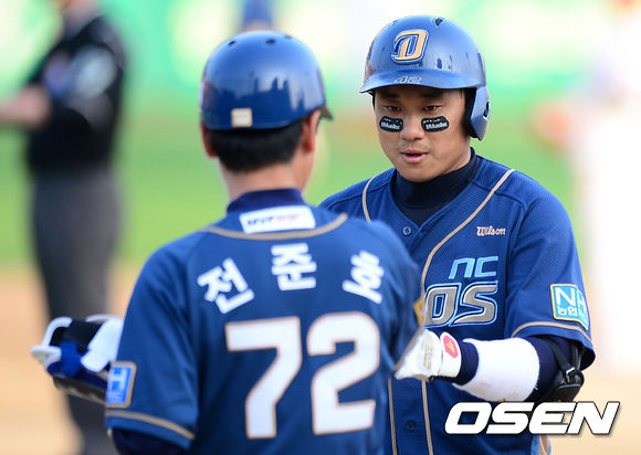 25일 오후 광주 무등야구장에서 열린 '2013 한국야쿠르트 세븐 프로야구' KIA 타이거즈와 NC 다이노스의 경기, 4회초 무사 만루에서 NC 김태군이 중전 적시타를 치고 전준우 코치와 하이파이브를 하고 있다.