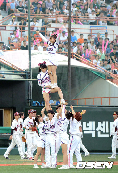 25일 오후 서울 목동야구장에서 열린 '2013 한국야쿠르트 세븐 프로야구' 넥센 히어로즈와 롯데 자이언츠의 경기, 5회말 종료 후 국제치어리딩협회 세계선수권대회에서 우승한 치어리더 팀 '임팩트'가 멋진 공연을 선보이고 있다.
