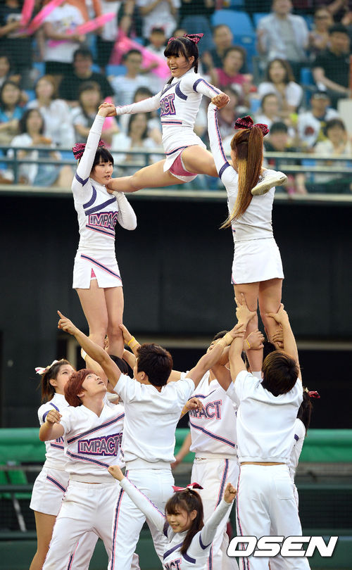 25일 오후 서울 목동야구장에서 열린 '2013 한국야쿠르트 세븐 프로야구' 넥센 히어로즈와 롯데 자이언츠의 경기, 5회말 종료 후 국제치어리딩협회 세계선수권대회에서 우승한 치어리더 팀 '임팩트'가 멋진 공연을 선보이고 있다.