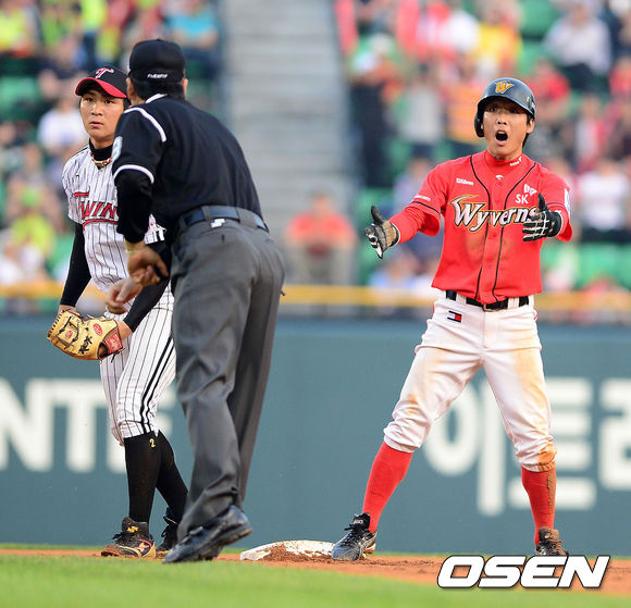 25일 오후 서울 잠실야구장에서 열린 '2013 한국야쿠르트 세븐 프로야구' LG 트윈스와 SK 와이번스의 경기, 7회초 1사에서 SK 조동화가 LG 오지환에 태그아웃당하며 2루 도루에 실패하자 아쉬워하고 있다.