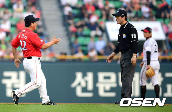 25일 오후 서울 잠실야구장에서 열린 '2013 한국야쿠르트 세븐 프로야구' LG 트윈스와 SK 와이번스의 경기, 7회초 1사에서 SK 조동화가 2루 도루에 실패하자 이만수 감독이 그라운드로 뛰어 나와 심판 판정에 불만을 나타내고 있다.