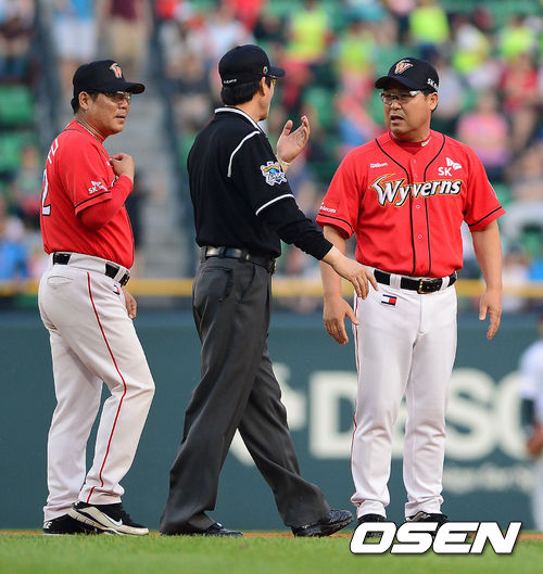 25일 오후 서울 잠실야구장에서 열린 '2013 한국야쿠르트 세븐 프로야구' LG 트윈스와 SK 와이번스의 경기, 7회초 1사에서 SK 조동화가 2루 도루에 실패하자 이만수 감독이 그라운드로 뛰어 나와 심판 판정에 불만을 나타내고 있다.